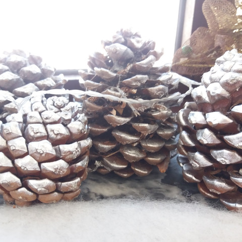 Pinte pinhas com tintas prateadas de forma a criar pequenos pinheiros de neve.